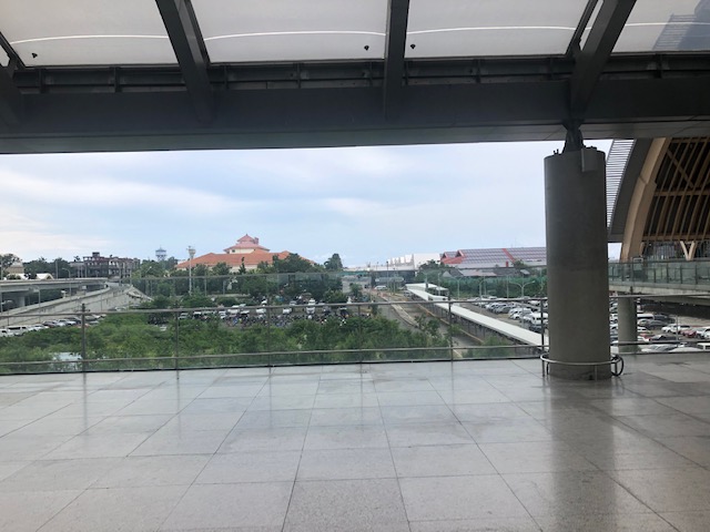The view from the walkway shows the Waterfront Hotel with its tiled roofs and the older MCIA Terminal 1 building (at right in the photo).