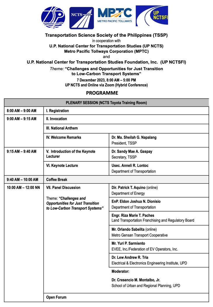 The Transportation Science Society of the Philippines (TSSP) held its 29th Annual Conference today, December 7, 2023. Following is the program for the conference, which featured a panel discussion in the morning and technical sessions in the afternoon.