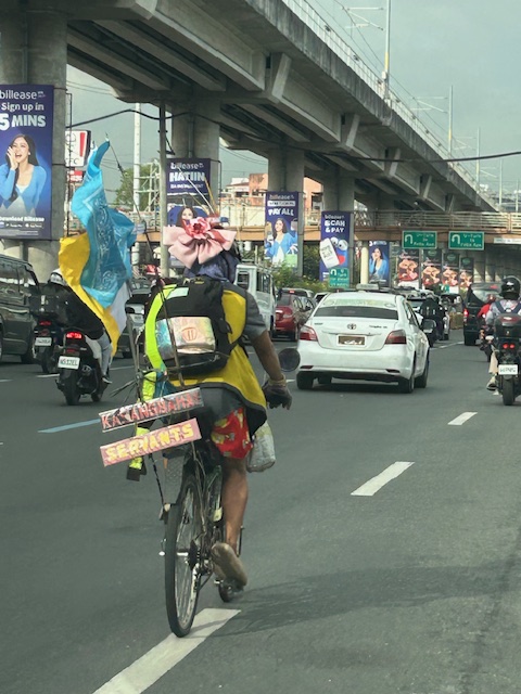 A couple weeks ago, we spotted this guy on a bicycle on our way to the office via Marcos Highway. It was easy to spot him along the highway as he pedaled along the middle lanes instead along the curbside or on the sidewalk. He was also a bit oddly dressed and there were some accessories to his bicycle.