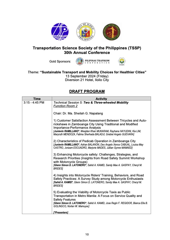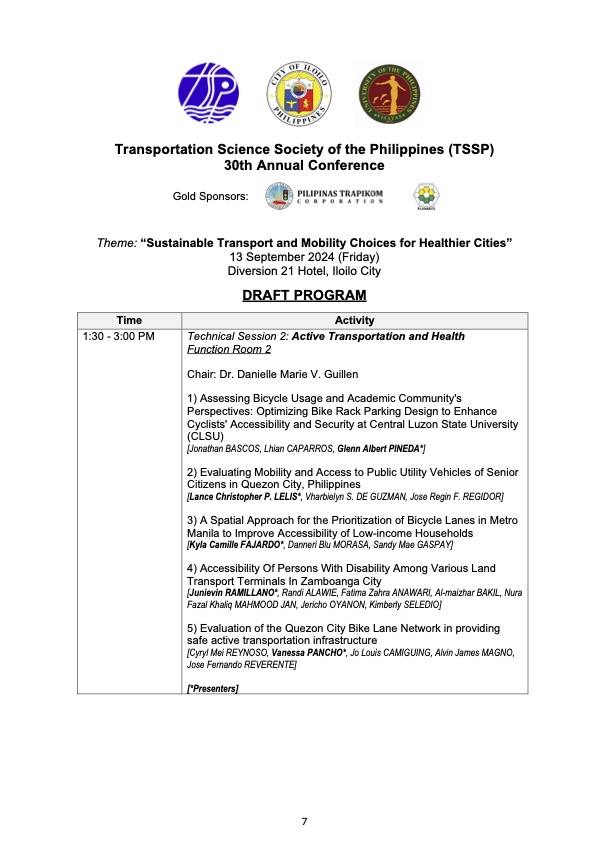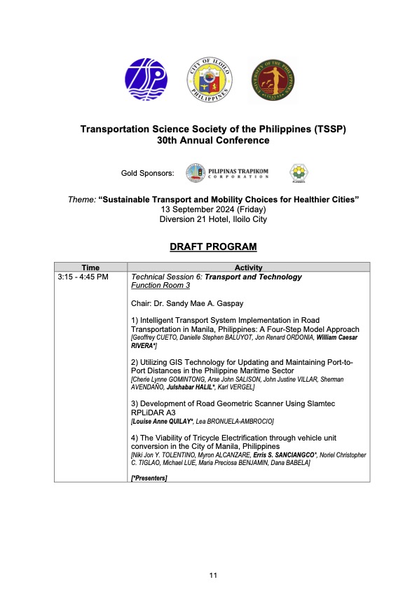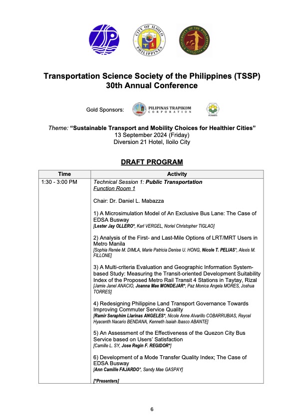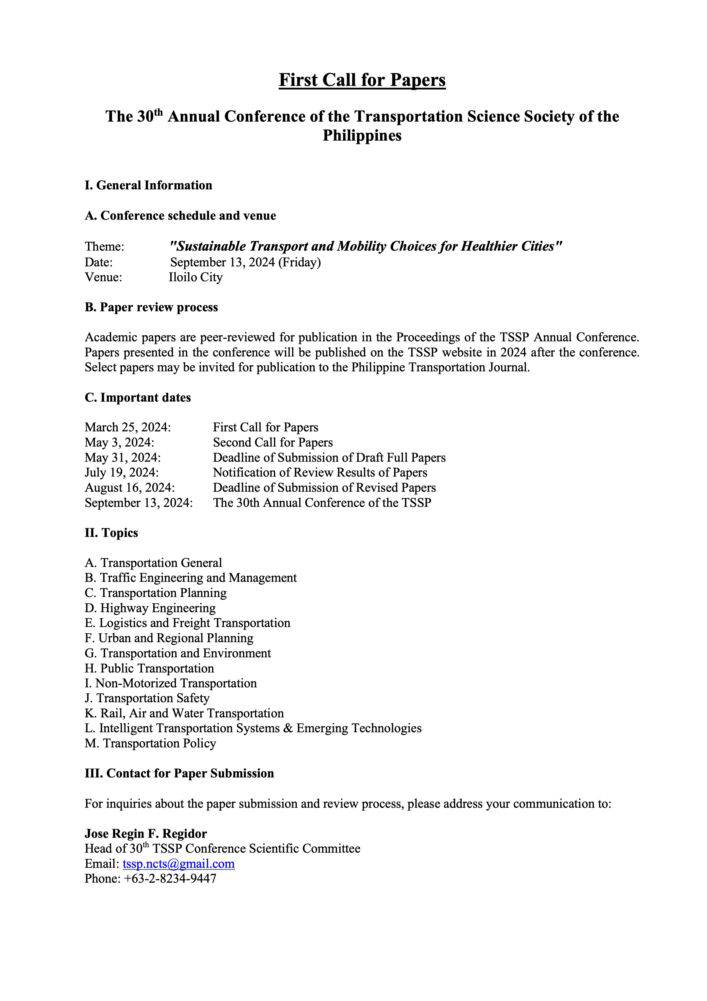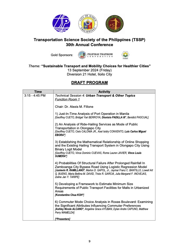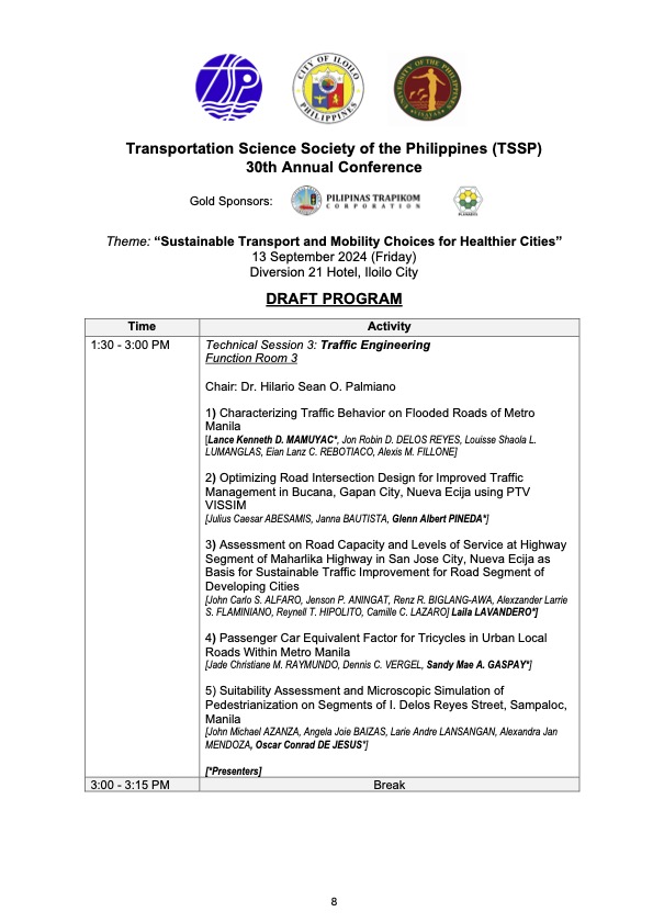 I am sharing here the latest draft of the technical sessions for the 30th Annual Conference of the Transportation Science Society of the Philippines (TSSP). The conference will be held in Iloilo City this coming September 13, 2024.