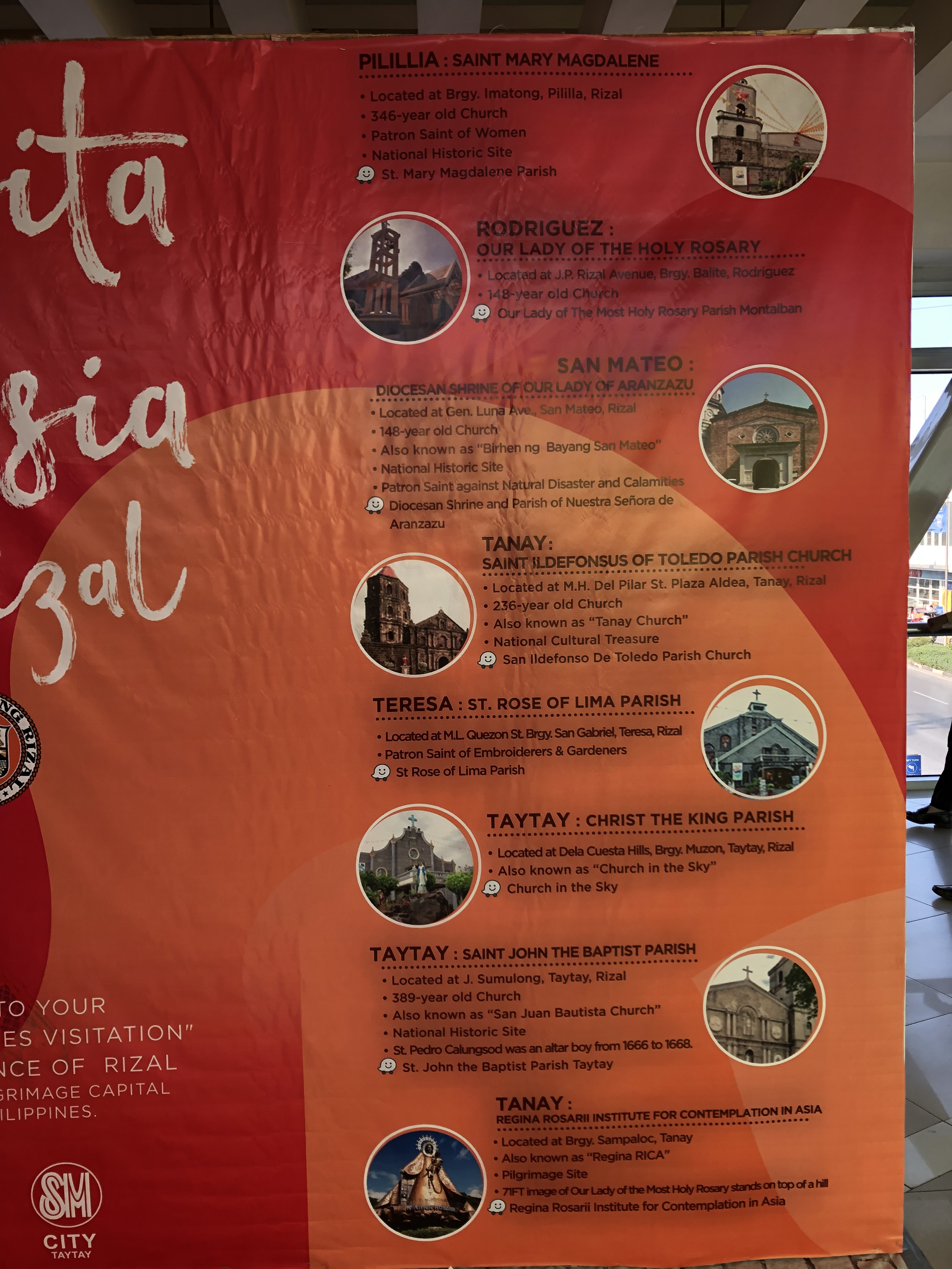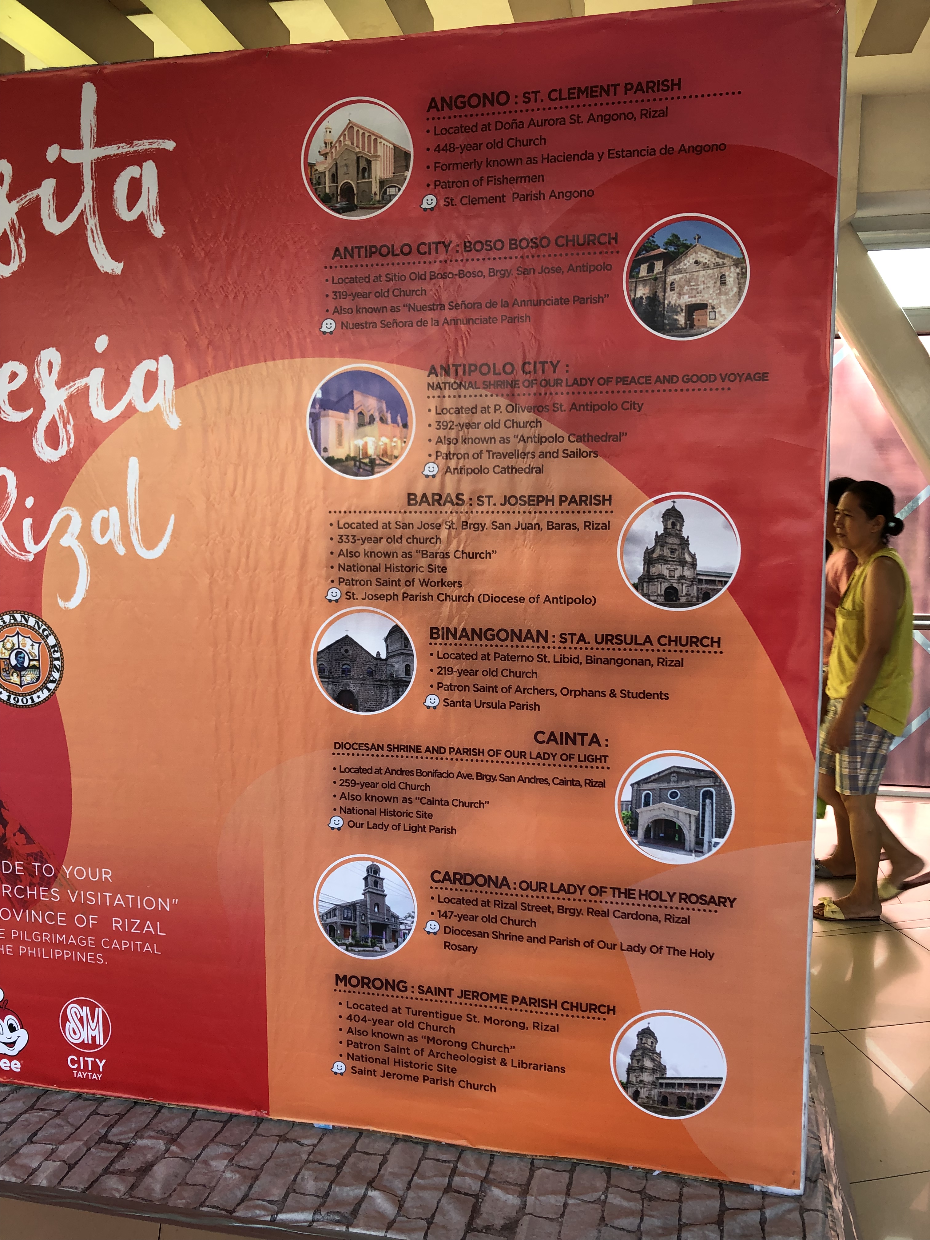 I spotted this ad at a nearby SM mall listing churches that can be part of a Visita Iglesia itinerary in the Province of Rizal. I took the following photos showing the major churches in the province. These include old churches found in the older towns including those in Morong (ca. 1620), Taytay (ca. 1630), Pililla (ca. 1672), Baras (ca. 1686), San Mateo (ca. 1716), Tanay (ca. 1783), and Binangonan (ca. 1800). Antipolo has one old church – Boso Boso Church (ca. 1669). The Shrine of Our Lady of Peace and Good Voyage while being the more famous of the two was completed in 1954. The first church though was completed in 1632 but was destroyed several times due to unrest, earthquakes and the Second World War. Cainta also had an old church (ca. 1707) that was destroyed several times including during WW2, and the new church was completed in 1968.