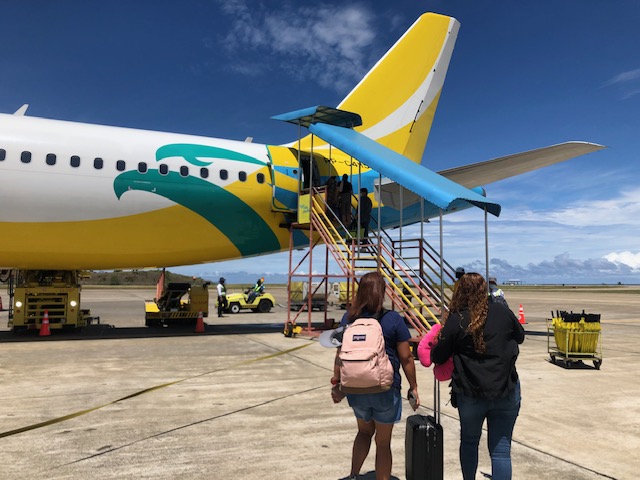 The view of our aircraft as we approach the stairs to the aft of the plane. Passengers seated from the middle to the rear of the plane are instructed to board the plane from the rear. Those seated from the front rows to the middle are instructed to board via the bridge or tube shown in the photo.