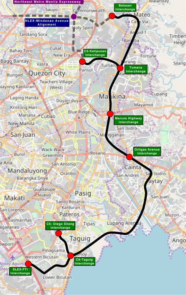 The recent announcement and launch of the Southeast Metro Manila Expressway (SEMME) included this map showing the (very) rough alignment for the proposed tollway. The map also shows the proposed locations of interchanges including one in Tikling and another in Masinag. There is also another in Tumana. From the looks of this, the SEMME will be a skyway or elevated expressway/tollway.