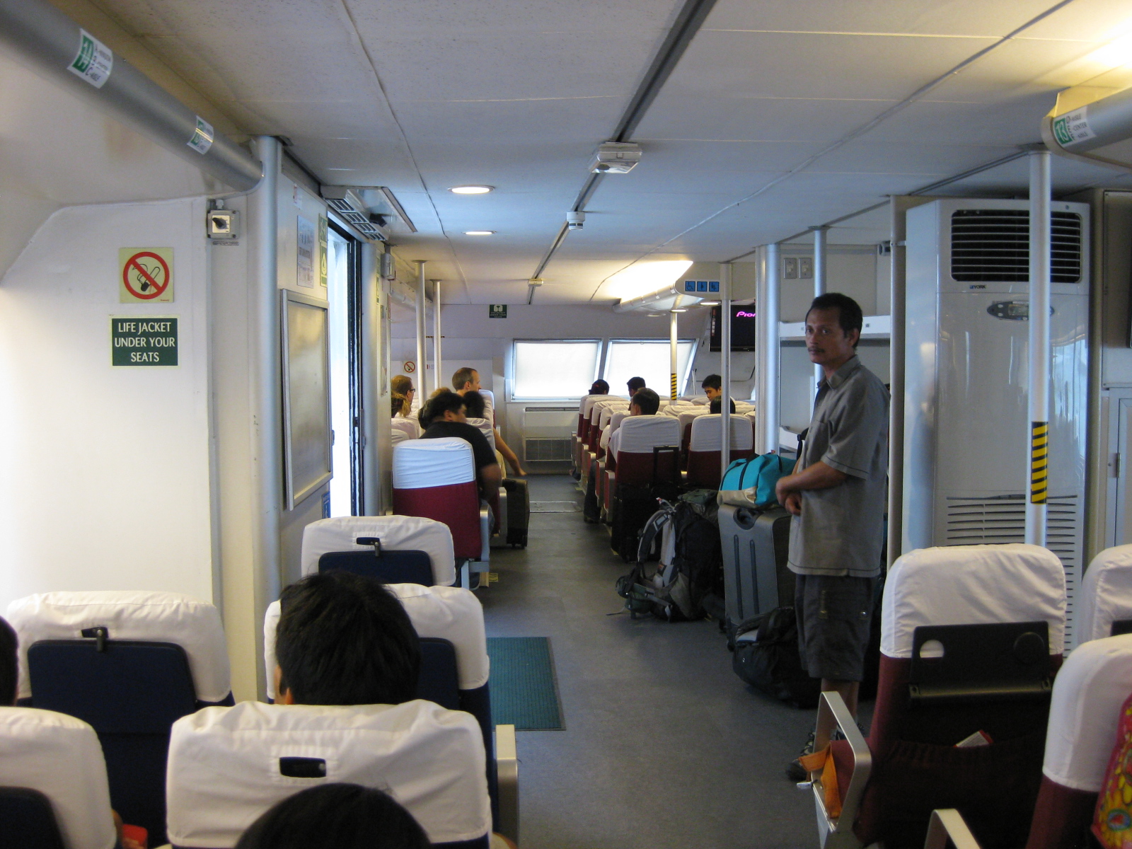 A view inside the passenger deck – seats were cushioned but mostly dilapidated and obviously requiring re-upholstery. The cabin seemed to be originally air-conditioned and we were lucky that the weather was fine and not so hot that day. Some passengers went to the upper deck to get some air.