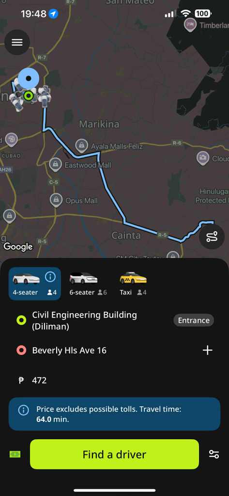 One time I had to travel home from my office in UP after my evening class, I decided to try this again. Here are the screenshots for my evening ride. The first image is for Grab and the second for In Drive. The routes indicated in the maps are the same. Noticeably different are the estimated travel times (73 minutes for Grab vs. 64 minutes for In Drive) and fares (at least 556 pesos for Grab vs. 472 pesos for In Drive). The choice here was easy – In Drive.