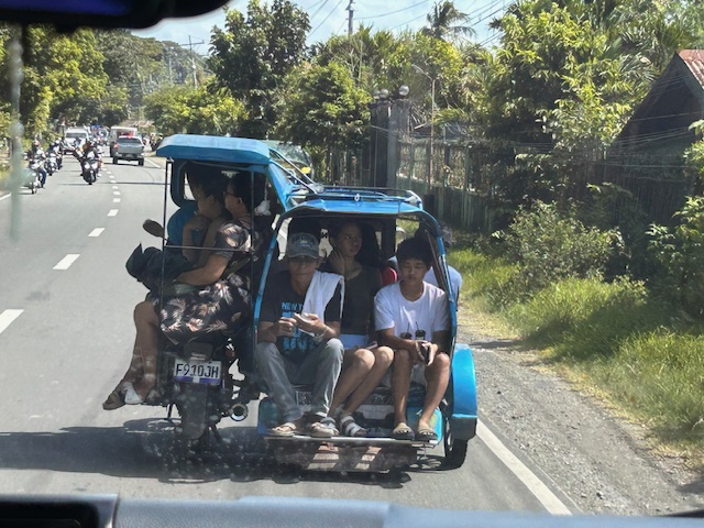A typical tricycle along the Iloilo-Antique road seats 8 to 9 passengers. Sometimes passengers even sit on top of the sidecar. Sidecars here and other provinces often have roofs designed to carry heavy loads including agricultural products. Usual trike sidecar seating have passengers facing front. This one has them “talikuran” or “back to back” with some passengers facing back – not really a nice view when traveling along a highway and vehicles tailing or bearing down on the trike.