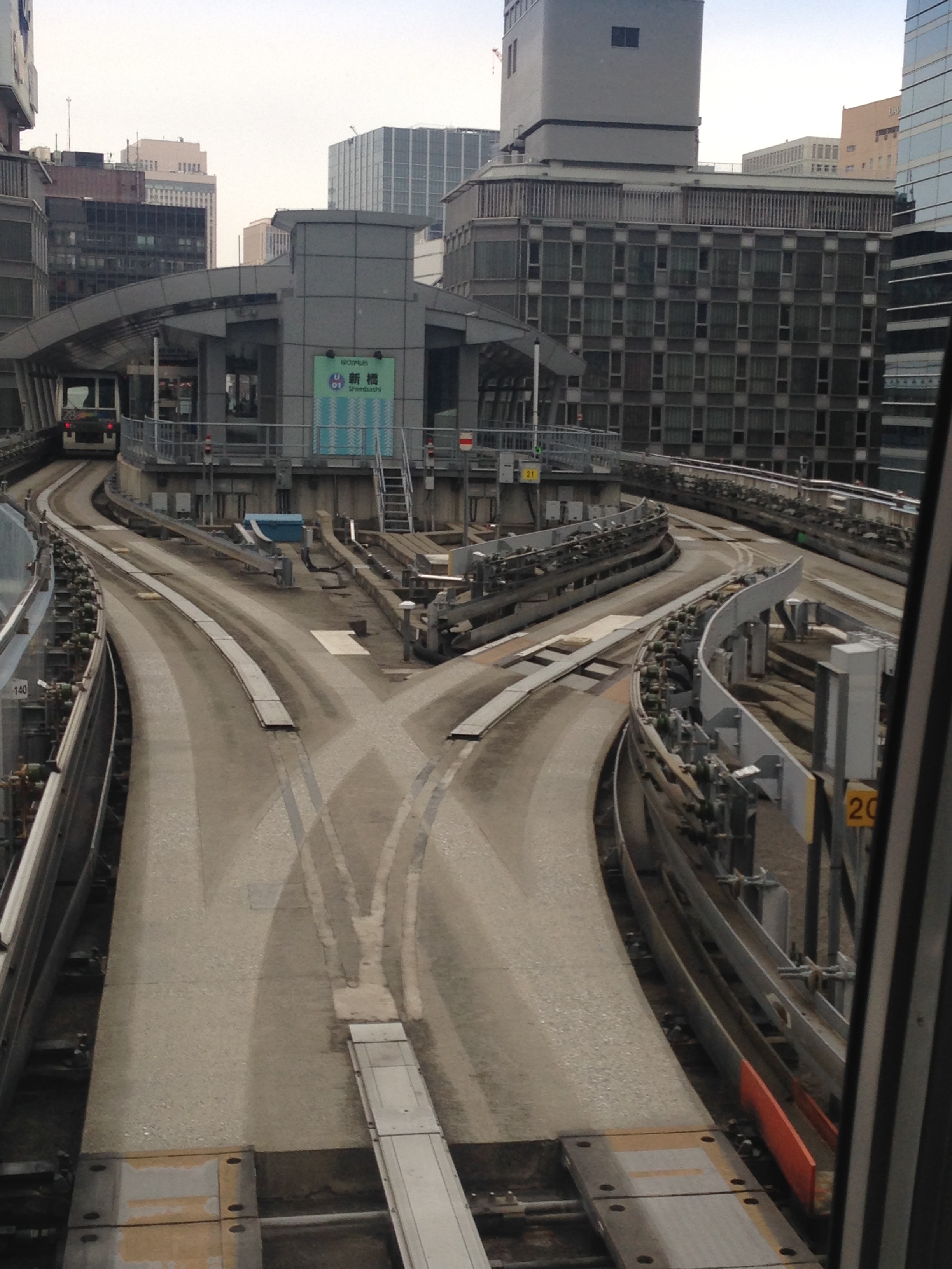 The approach to Shimbashi Station shows the AGT equivalent of a switch to allow arriving vehicles to change directions towards the platforms of the end station.