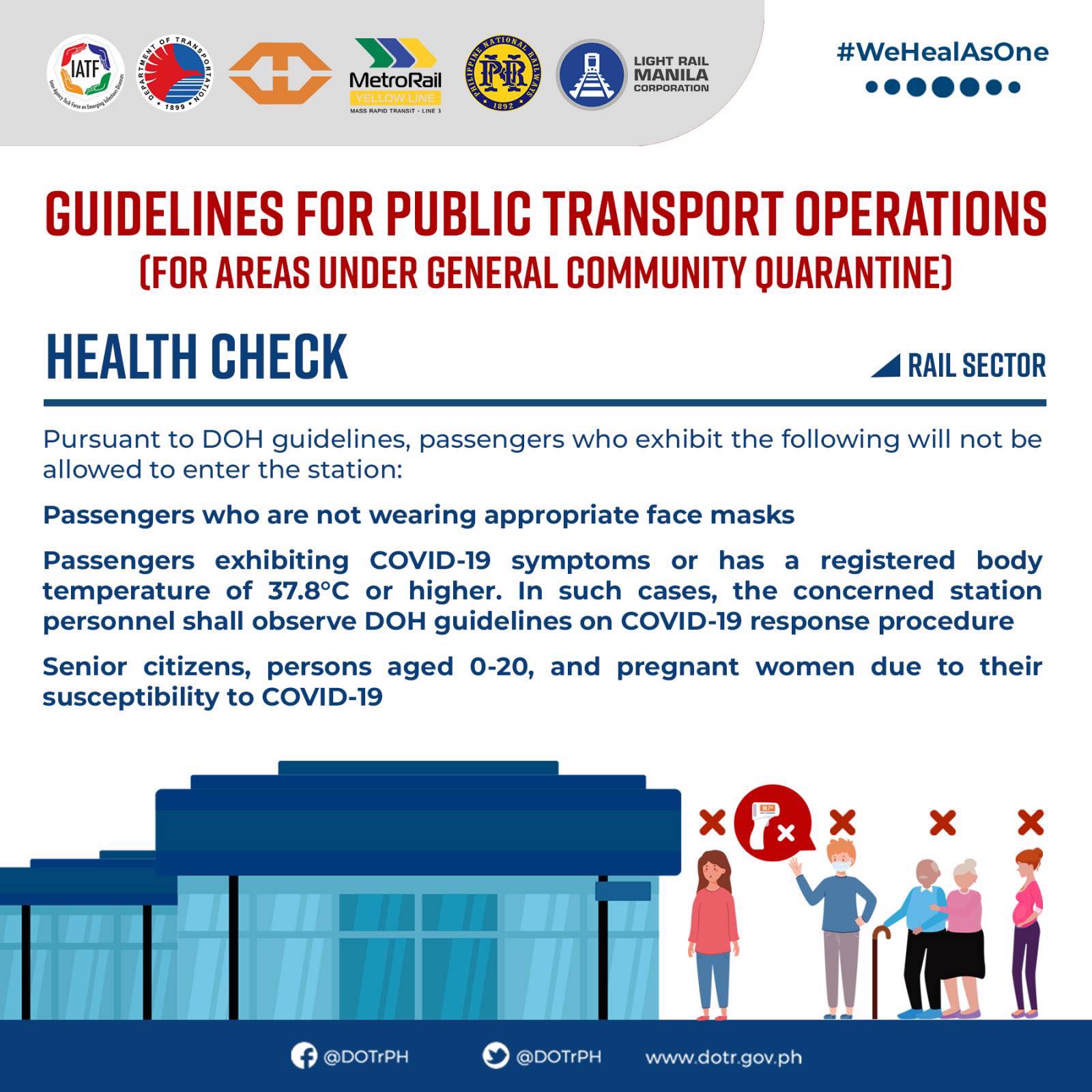 I had previously posted for information and reference the Department of Transportation’s (DOTr) guidelines for road public transportation. Here are the guidelines for rail public transportation: