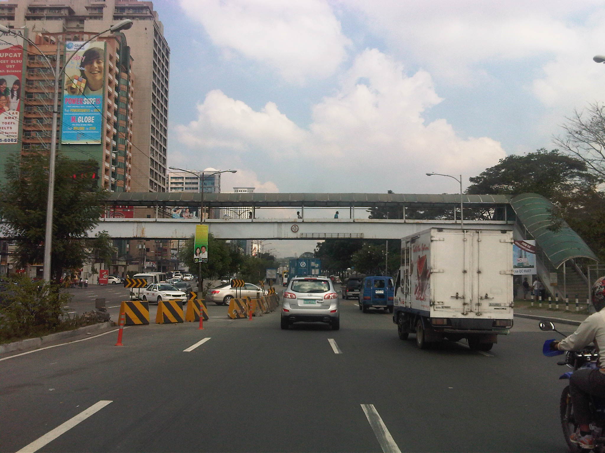 In order to address the vehicles counter-flowing or encroaching on the opposing traffic lanes and jaywalking problem, steel barriers were put up in the middle of the road. Overpasses like the one in the photo were constructed to enable people to cross the road. Notice the vehicles parked or standing along the road and on the sidewalks?
