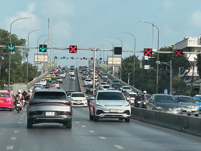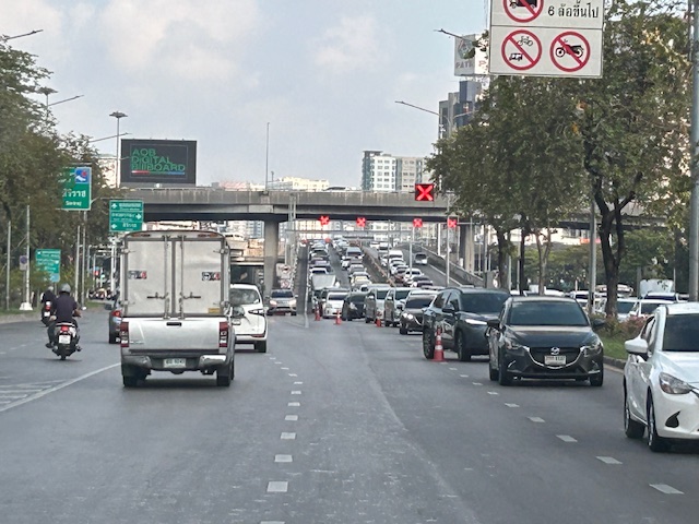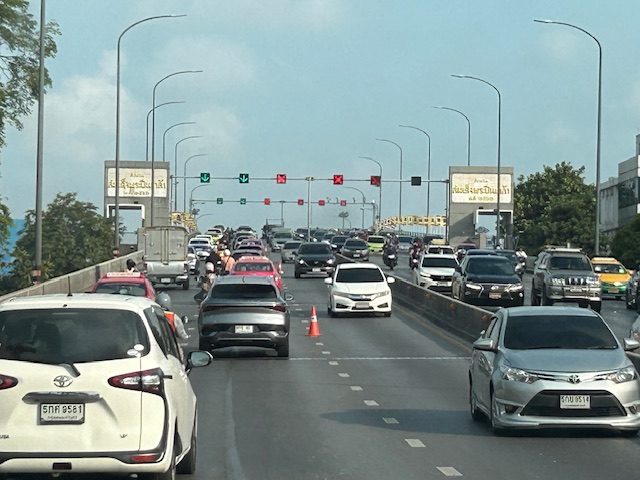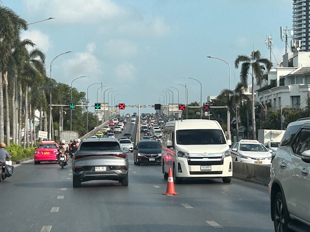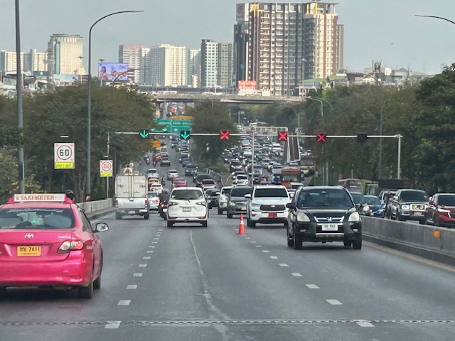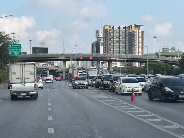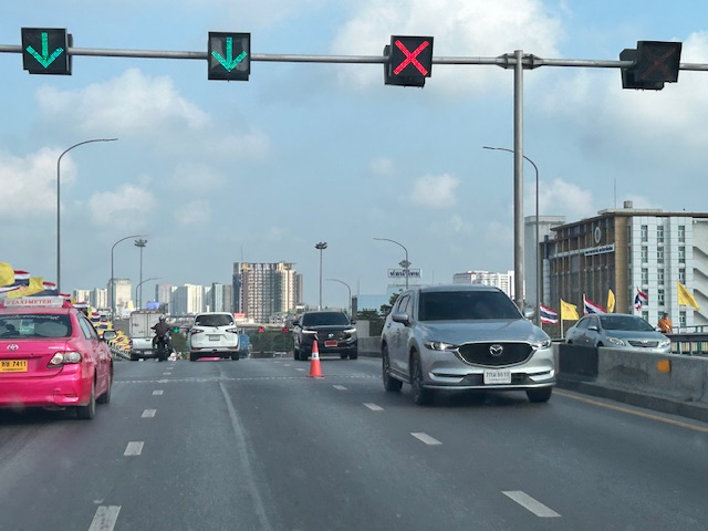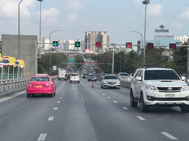 I almost forgot again about this set of photos showing the implementation of a counterflow scheme along a long stretch of road in Bangkok. Heading out of Bangkok, I was able to take photos of the counterflow lanes and variable traffic signs used for this purpose. We were northbound meaning we were traveling outbound of the metropolis and opposed to the peak direction (southbound was inbound to Bangkok).