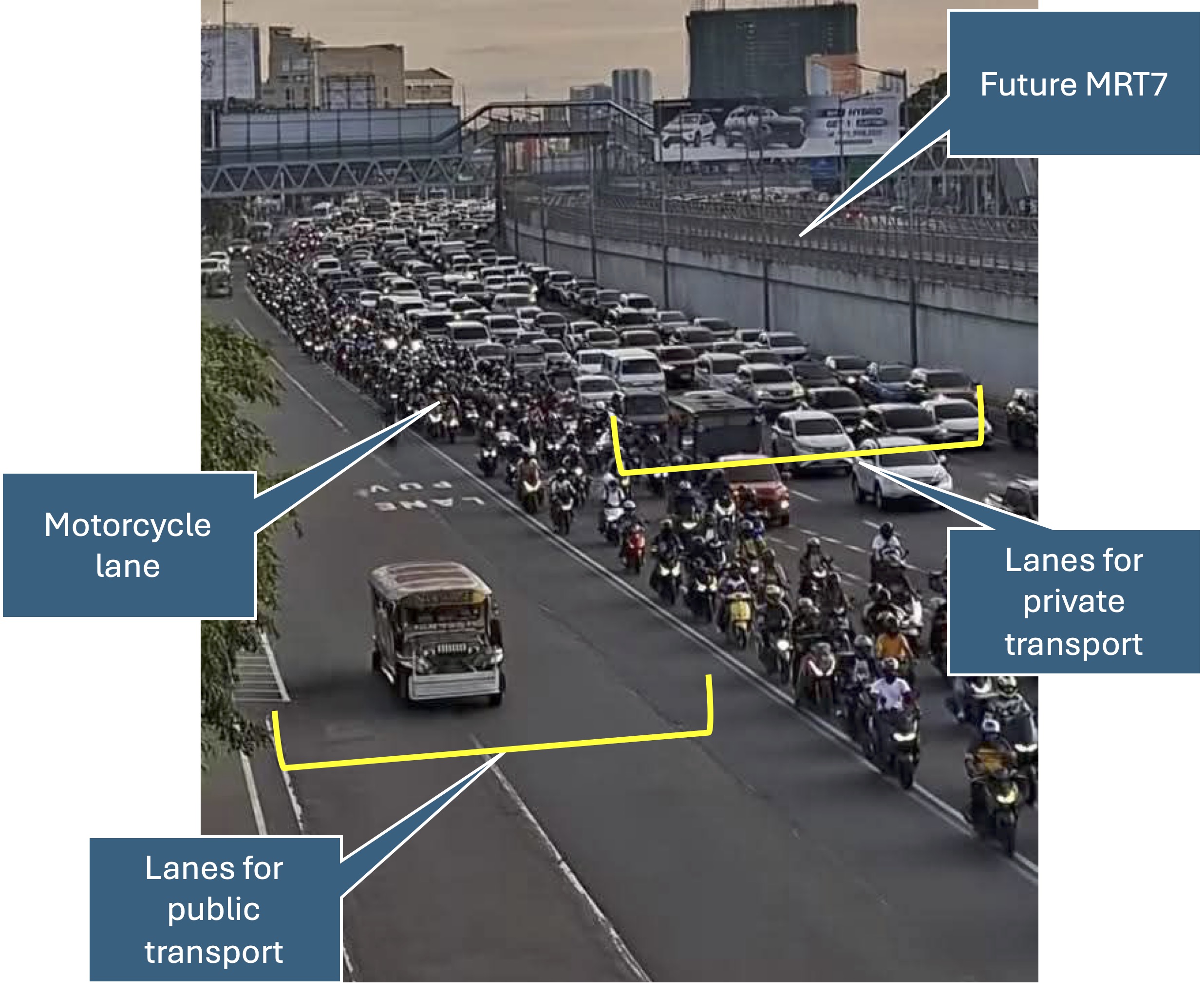 The No Contact Apprehension Policy (NCAP) is finally being implemented in Metro Manila. The results so far has been dramatic in terms of the number of violations recorded and the images being shared so far about how motorists are behaving. Below is one of those photos being shared on social media to which I added some annotations. I will use this later to comment on the NCAP and how we can use the outcomes to assess the transportation situation and determine what interventions can be done. Some are already obvious from the photo – the lack of public transport options lead to people depending on private motor vehicles like cars and motorcycles for their commutes. MRT7 is yet to be operational and road public transport has not been rationalized.