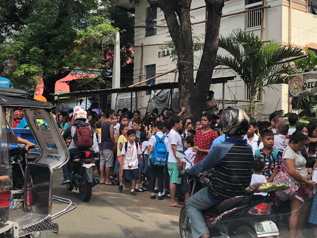 Students arriving at the school have to fall in line and wait for the morning batch to come out. There is very limited space outside the school so people including parents and guardians spill out of the sidewalks and occupy part of the curbside lane.