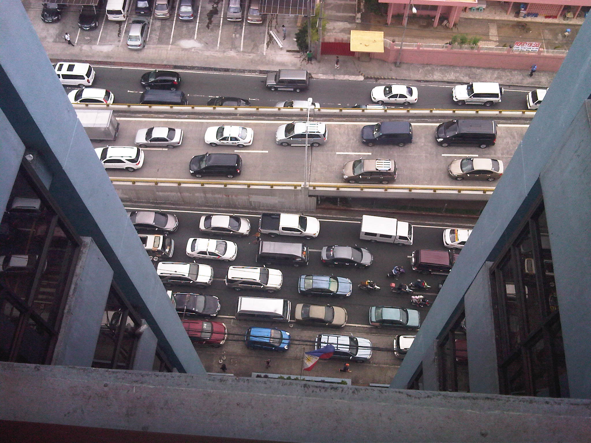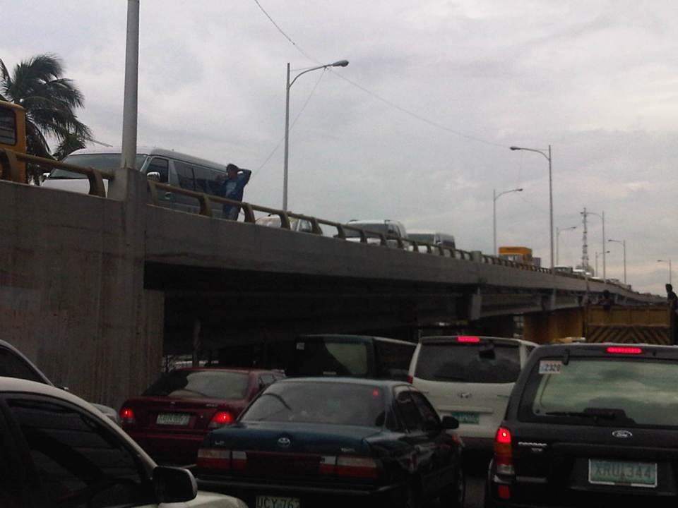 Another view of the congestion at both ground and overpass levels. Traffic is really bad when you have ambulant vendors walking along the overpass to sell their wares (e.g., cigarettes, candies, water, etc.) like what the man on the overpass near the van is doing.