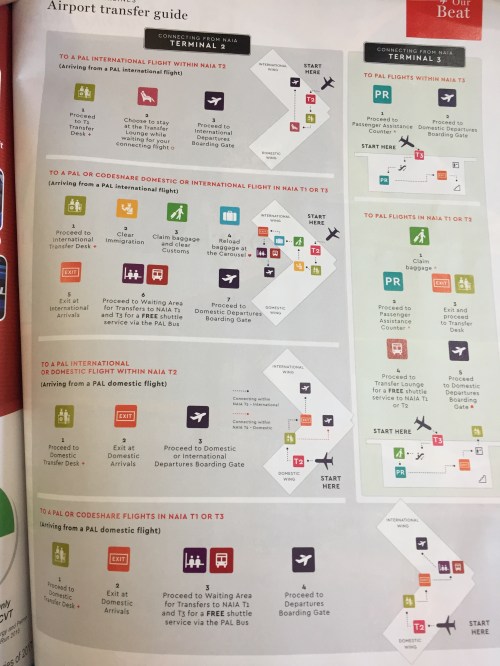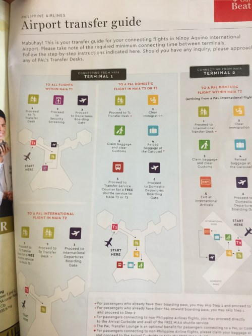 I was able to get the following photos of a couple of pages from the Philippine Airlines (PAL) inflight magazine Mabuhay. The photos show an airport terminal transfer guide for the Ninoy Aquino International Airport (NAIA), which has 4 terminals. Since I get a lot of traffic and questions about terminal transfers in this blog, I thought it practical and informative to just post these here for everyone’s benefit.