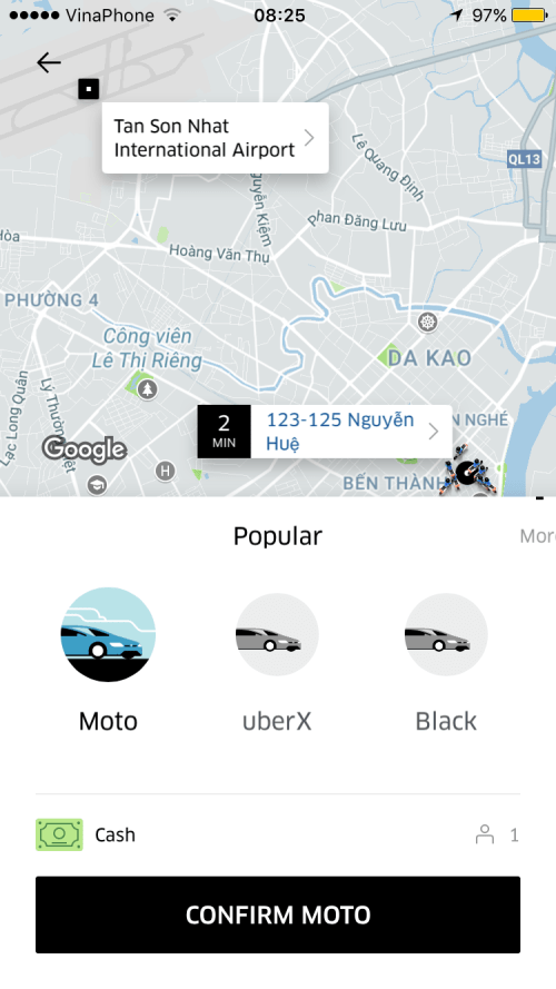 Uber has a motorcycle taxi option in its app in Vietnam. This is a screenshot I took as I loaded their promo code for our conference (Uber was a major sponsor.).