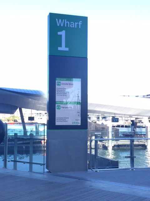 Sign showing which ferry lines dock at Wharf 1: F4 is for Circular Quay and F3 is for Parramatta, which includes a stop at Cockatoo Island.
