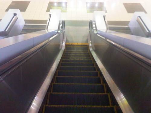 View along the escalator descending towards the pre-departure area – upon reaching the bottom, one will find himself/herself facing counters selling food and drinks to travelers.