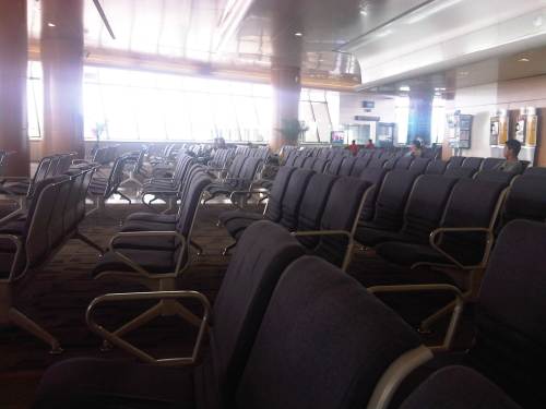 Seats at the pre-departure area of the terminal – this is the free seating area that is not associated with any airline. Normally, areas are cordoned off for passenger control and security measures prior to boarding by any airline. The seats are relatively old but are clean and some appear to have been re-upholstered.