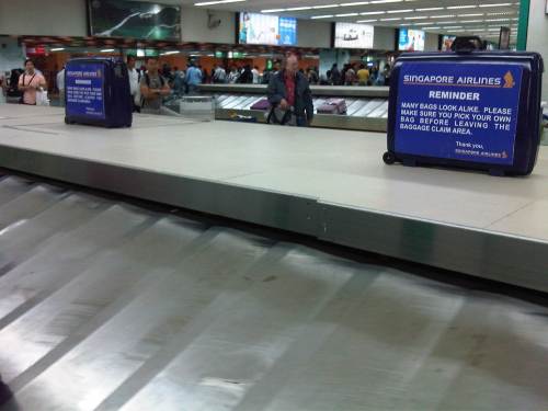 Singapore Airlines placed these signs on old luggage to caution passengers on picking up or identifying luggage from the carousel.