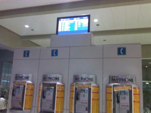 Small screen showing information on aircraft arrivals just above the public phones