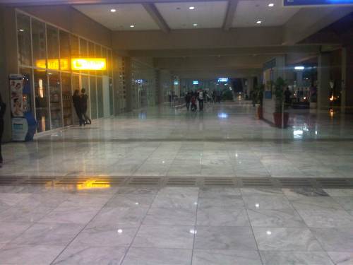 Spacious arrival concourse exclusive to passengers (well-wishers are not allowed here). The yellow sign indicates the small duty-free shop near the exit from the terminal building.