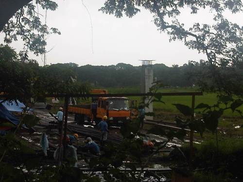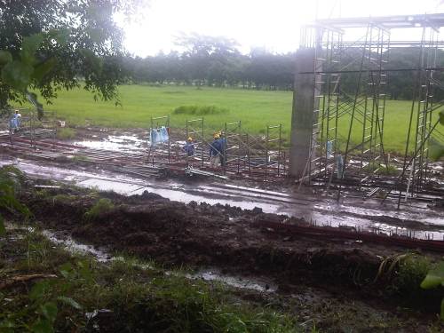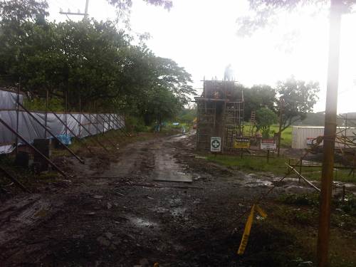 Construction work continues despite the wet weather. The week-long monsoon rains have rendered the ground muddy or mushy but workers are busy as if it were summer.