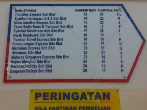 One can purchase tickets to any point in Malaysia (local long distance trips) and Singapore (another country) is among the most popular destinations. Schedules and fares are posted for information of travelers.