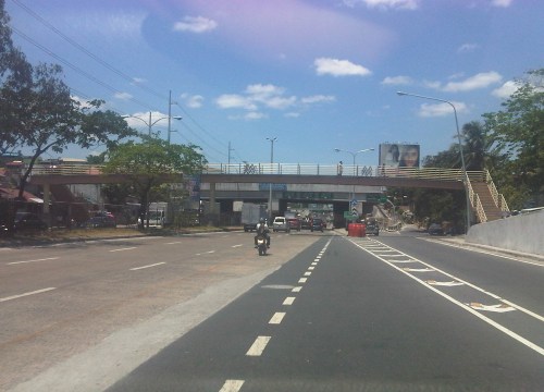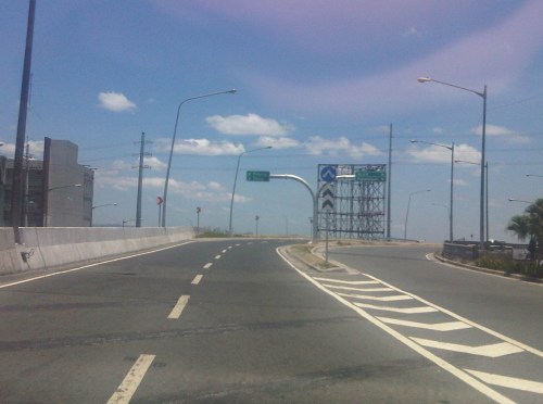 Approach to the new overpass – the chevrons are supposed to guide motorists as to the separation of traffic lanes. The lane to the right leads to the service road for Market! Market! and connects with C5 southbound.