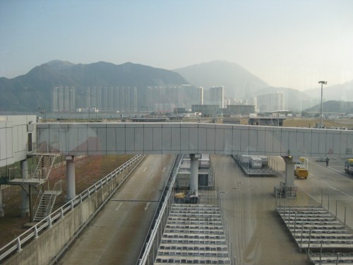 View from afar – airport access may be via road or rail transport and one could see the Hong Kong cityscape from the airport. In the photo, the tall buildings before the mountains are probably high-rise apartments where many reside. HK is a very dense city, which necessitates such residential developments instead of the single-detached and even walk-up types to account for space limitations.