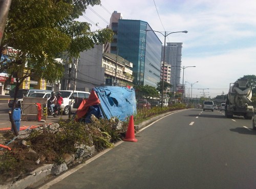 The old median island has already been removed to make way for an additional lane along Katipunan (C-5) northbound. This will increase the number of lanes from 3 to 4 and should ease traffic when classes open in June. Meanwhile, the trees have been replanted on the adjacent lane on the southbound direction where a new median will be constructed.