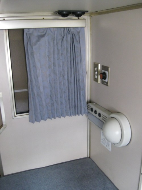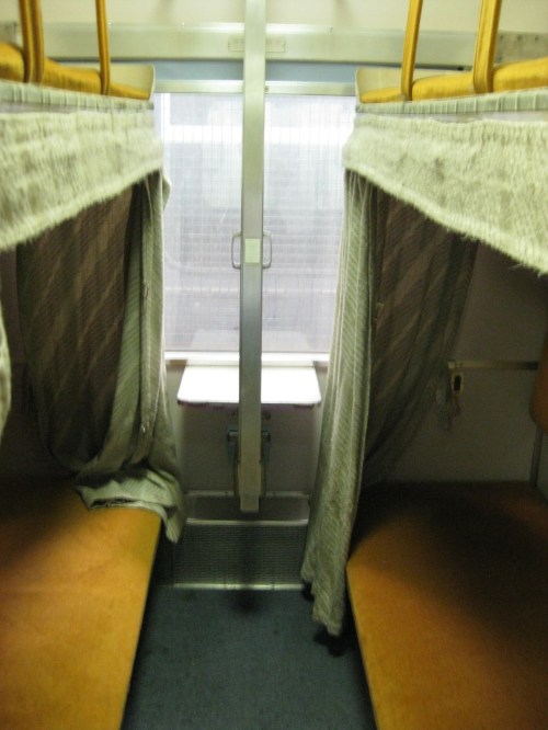 Hallway – our students pose for photo along the corridor to illustrate the space in a sleeper car. There is a small seat that can be unfolded from the side wall across from each cabin door. Perhaps this is not really for use by the conductor but an extra seat for groups having a huddle or individuals wanting a seat to get a good view from the other side of the train. There’s are thick curtains that serve to provide privacy for each cabin. Each car is connected to each other so it is certain that passengers from other cars may be walking along these corridors.