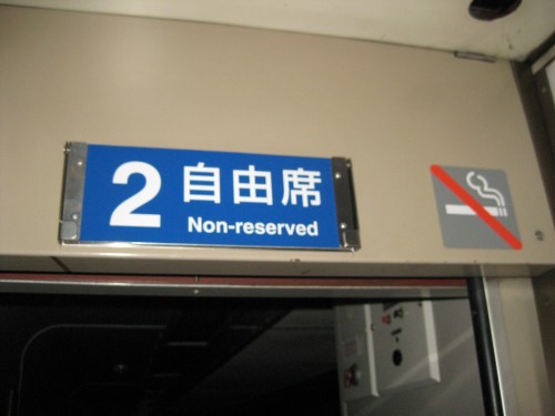 No reservations – in Japan “Non-reserved” means that seats on the car are first come, first served. One could purchase either such seats or the more expensive reserved seats from the train station.