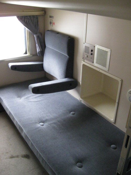 Executive sleeper – the cabin has a bed that doubles as a seat. Note the foldable arm rests and back cushion by the window. Also, there is space for a small bag located at a more secure part of the cabin.