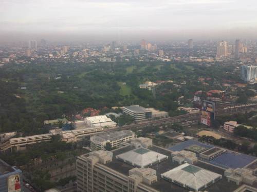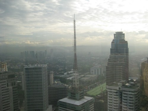 Golf anyone? – from one side of the building, you could see Wack-wack golf and the EDSA-MRT as well as the roof top of the ADB headquarters. One can also see the thick band of dark brown (or is it brownish black) that is the smog covering much of Metro Manila. Early morning golfers and joggers probably are not aware of the health implications of their activities that morning. The building where the DOTC has its offices is located is also visible in the photo (middle of the right edge of the picture).