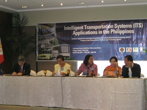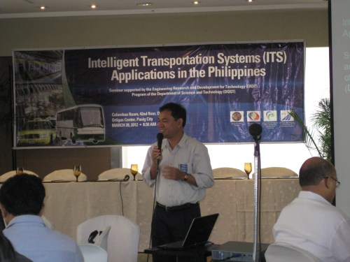 The Seminar on Intelligent Transport Systems (ITS) Applications in the Philippines was held last March 28, 2012 at the Columbus Room of the Discovery Suites in Ortigas Center, Metro Manila. The seminar was organized by the Institute of Civil Engineering (ICE) and the National Center for Transportation Studies (NCTS) of the University of the Philippines Diliman and was supported by the Engineering Research and Development for Technology (ERDT) Program of the Department of Science and Technology (DOST). The main objective of the seminar was to bring together the academe, government agencies and industry to discuss the state of ITS in the country. The seminar was a venue for presentations and discussions where persons interested in ITS could interact with one another, hopefully forging future partnerships to promote ITS in the country.