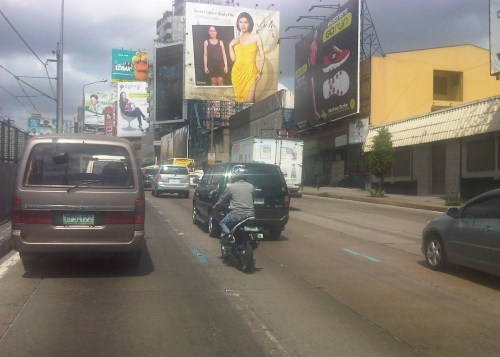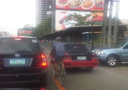 NMT lane-splitting – I was fortunate to be able to capture this scene where a man on bicycle splits the lane along EDSA. The lane here is actually part of the 2 outermost lanes designated for buses (yellow lanes). However, in the vicinity of intersections, private vehicles are tolerated to use the lanes as the turn into or off from EDSA. I don’t think there is good data on how many bicycles travel along EDSA (or sections of the highway) everyday. This would be an interesting statistic that could enable us to determine the demand for cycling along this highway.