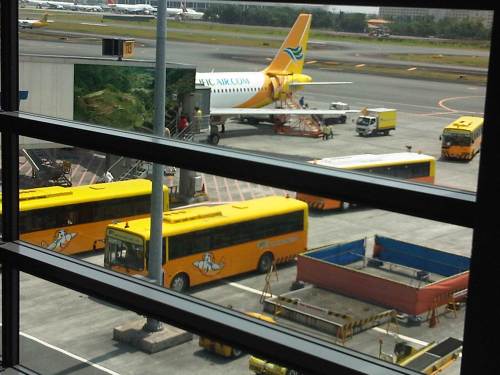 I was waiting for the boarding call for my flight and took the photo below of passengers deplaning via the stairs at the aft door and the air bridge. These were loaded unto the waiting buses, which ferried them to the terminal building.