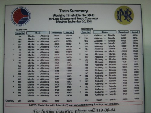 Train schedule for the PNR commuter line – service frequency is still low with headways of 30 minutes (a train every half hour). With the number of passengers steadily increasing, the current capacity of trains has already been exceeded. The PNR should resolve issues pertaining to conflicts along its tracks and deploy more trains and/or more cars.