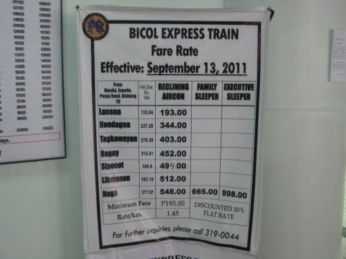 Fare table for the resurrected Bicol Express – family and executive sleepers were supposed to start operation last March 16. We were told that the PNR hosted representatives of travel/tourist agencies to an exclusive initial run of the sleeper and recliner cars to Bicol and back. This was part of the promotion of rail services to travelers especially as the summer months are approaching.