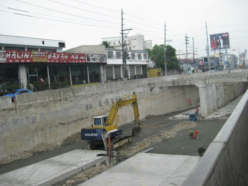 Backhoe at unpaved section of the underpass. The design reminds me of the underpass section along the same Quezon Ave. at its junction with Agham Road. Visible from the photo are braces/anchors embedded into the sides of the walls to reinforce these and prevent collapse.