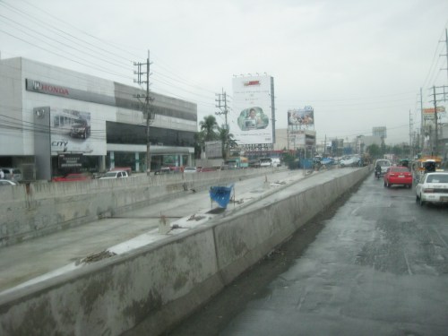 The MMDA and the DPWH are currently constructing what they term as lane separators along Commonwealth Avenue. These are concrete islands very similar in form to curbs, whose function is to delineate the outer lanes of Commonwealth. These will physically separate public utility vehicles from motorcycles and most private vehicles who generally use the middle and inner lanes. There are, however, early criticisms due to what is perceived as an increased risk for crashes due to the separators themselves. Some motorcycle groups have already expressed their apprehensions about the facilities that were supposed to protect them from aggressive PUVs. Meanwhile, one DPWH official was interviewed and proudly claimed the safety features of the separators including their being unmountable by large vehicles. From the height of the separators shown in the following photos, I am not so sure that these devices can stop trucks or buses, even jeepneys or cars from going over the other side.