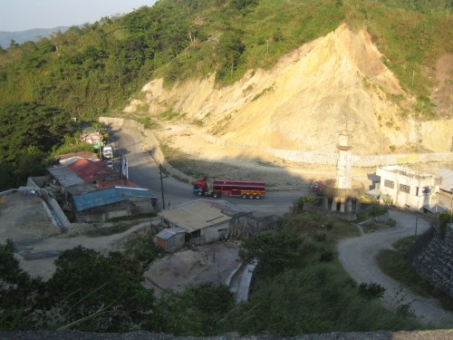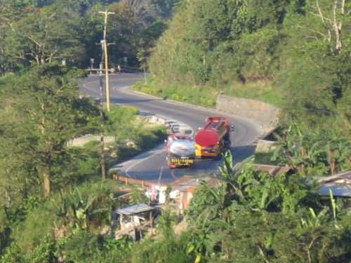 Trailer tanker heading north along Balete Pass. The photo shows the foot of the hill where the view deck is located. The access road to the view deck is shown on the lower right. There are stores on the left that cater to tourists and other travelers.