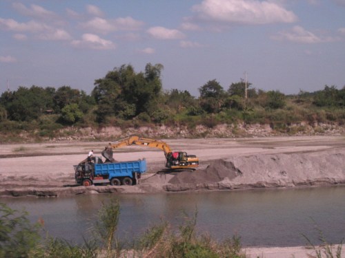 Scene along the highway sections along which is a river. Quarrying for construction materials like sand is quite common and a major source of revenue for many Pampanga towns. Such activities have also been controversial due to the fees charged by the local governments, particularly how these are divided among towns and where these are used.