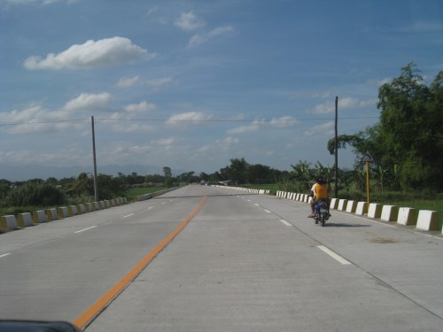 The bypass road should have been a two-lane, two-way highway with shoulders at either side of the road. The yellow line in the middle of the road may be appropriate to advise against overtaking or passing but the white broken lines should be replaced by solid lines to delineate the shoulders from the traveled way. Yup, that’s a tricycle along a national road.