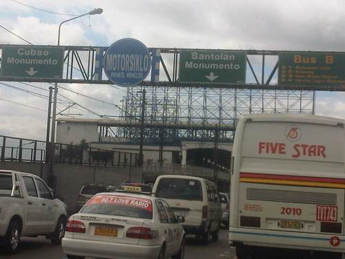 Motorcycle lane sign installed on pedestrian overpass between Aurora Blvd. and Kamias. Notice the provincial bus encroaching upon the adjacent lane designated for private vehicles.