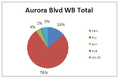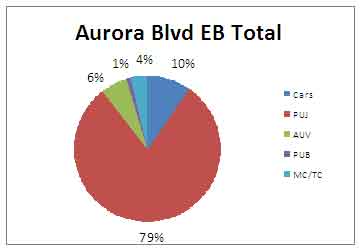 Person trip mode shares along Aurora Boulevard eastbound (to Rizal & Marikina) – jeepneys account for 79% of road-based transport while cars carry 10% of person trips. In terms of vehicle share of the road, cars account for about 25% of the road while jeepneys take up about 59% after converting jeepneys into passenger car units using the assumption of 1.7 pcu = 1 jeepney. Such assumption is also used in other estimates.