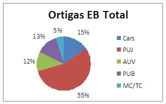 Person trip mode shares along Ortigas Avenue westbound (to Mandaluyong/Manila) – jeepneys account for 55% , buses 20% and AUVs 8% of road-based transport (total of 83% for PT) while cars carry only 13% of person trips. Cars take up 38% of the road, jeepneys also 38%, AUVs 9% and buses only 4.5%.