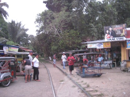 My first look at the motorized trolleys of Quezon – this photo shows what seems to be a terminal for two type of paratransit: the road-based tricycle (left) and the rail-based trolley (right). Being a convergence point for passengers, there are stores and eateries in the area. Note again the condition of the tracks where the wooden ties are still visible.