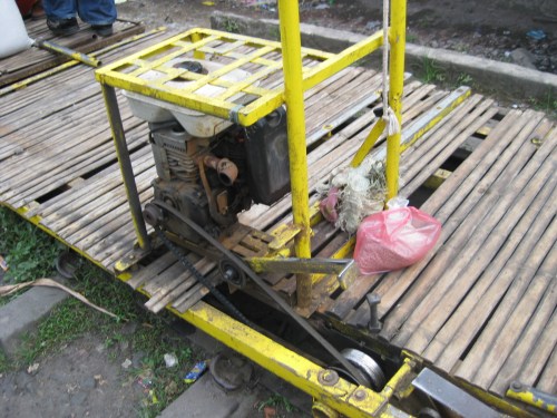 Driving wheel – while trains may be powered by locomotives, the trolleys have motors typically used by pumpboats and by the tricyboats found in the Visayas and Mindanao (tricycles powered by the same motors). The driving wheel is connected to the motor to move the vehicle and the contraption on the lower right and just beside the driving wheel is the brake mechanism. Thus, the driver is usually positioned just behind the motor where he has access to both the motor and the brakes.