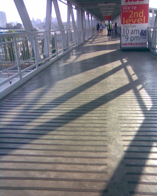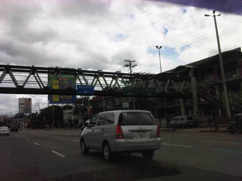 The long walk to the MRT station – from this perspective, it seems the walkway connects directly and almost level with the station platform. It is not at all connected directly with the station. Instead, one has to walk towards the end of this path and then down the stairs that end at the sidewalk near the PUV loading/unloading area. To get to the station, one has to walk some more. The posts appear to be provisions for the installation of a roof over the walkway to shield people from the elements.